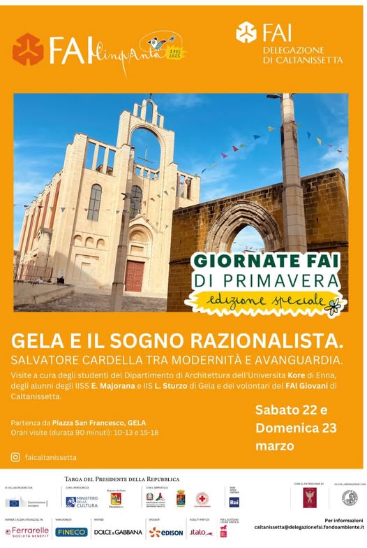 Sarà possibile percorrere con il FAI un itinerario attraverso il centro storico di Gela “Gela e il sogno razionalista: Salvatore Cardella tra modernità e avanguardia” e, per gli iscritti FAI, osservare dall’alto della Torre dell’Orologio e dalla terrazza della chiesa di San Giacomo la planimetria della piazza e il dettaglio architettonico delle case circostanti, anch’esse opera dell’architetto Cardella.