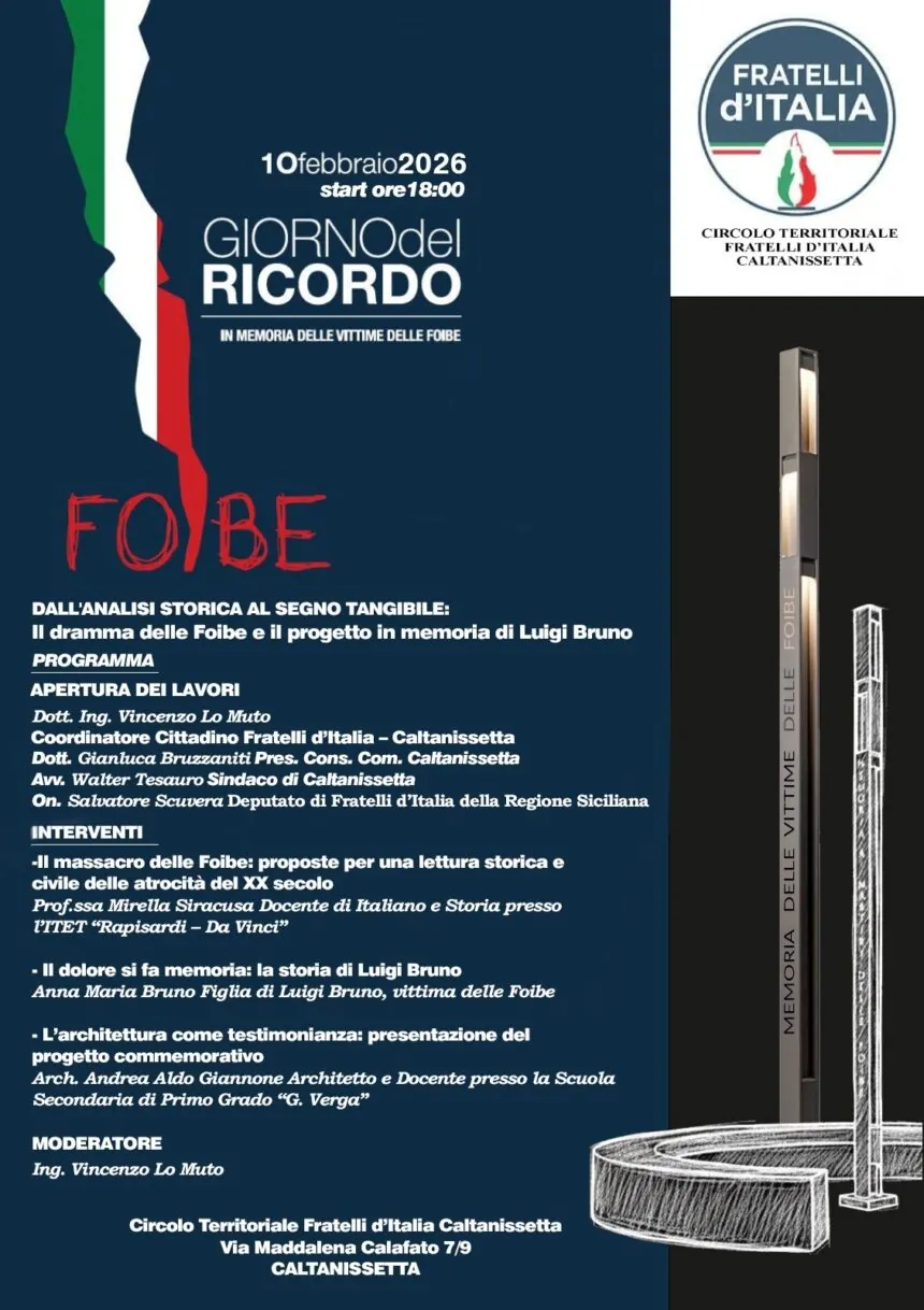 “Dall’analisi storica al segno tangibile” è il titolo dell’incontro dedicato al Giorno del Ricordo delle vittime delle foibe, organizzato martedì 10 febbraio dalle ore 18 dal Circolo territoriale di Fratelli d’Italia di Caltanissetta.
