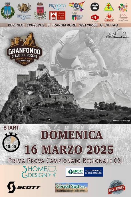 C’è già il nome e la data e perfino il manifesto: Gran Fondo delle Due Rocche che si terrà il prossimo 16 marzo a Mussomeli con partenza alle 10 dalla ritrovata Piazza Umberto. E sarà la Prima Prova del Campionato regionale CSI  2025 per gli amanti delle due ruote.