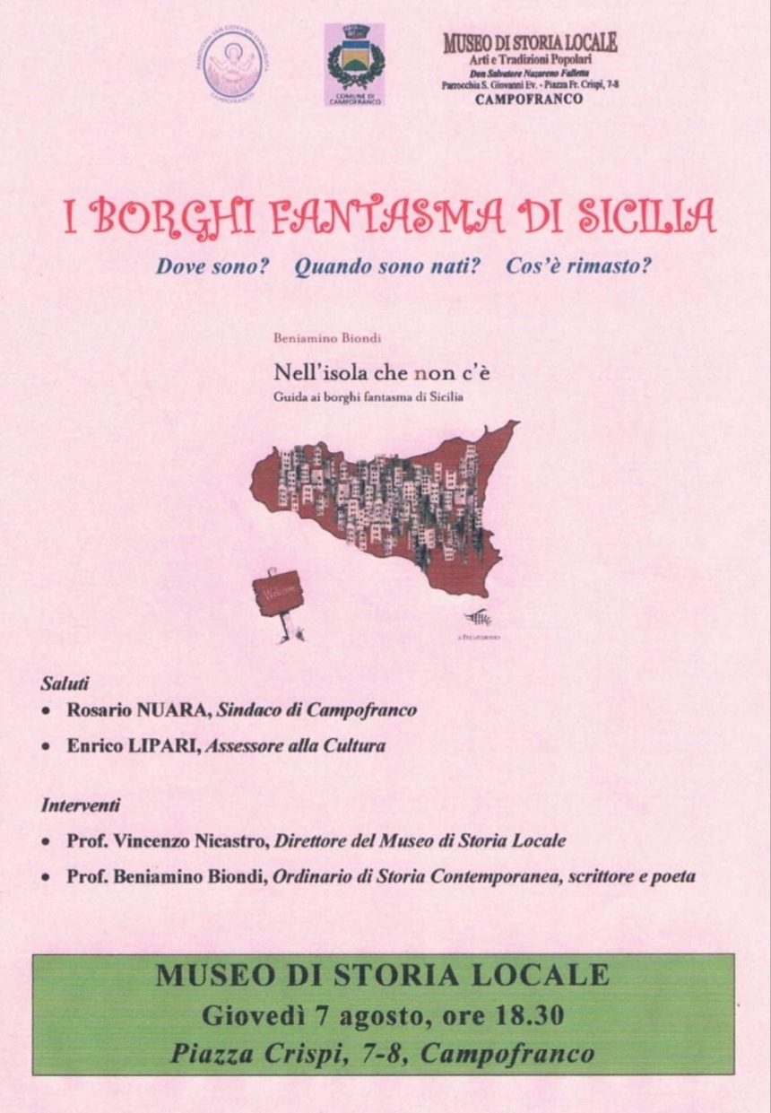 Giovedì 7 agosto alle 18,30 il Museo di Storia Locale di Campofranco ospiterà un interessante incontro socio-culturale, su un tema di scottante attualità nelle zone interne: “I Borghi fantasma in Sicilia“, che prende spunto dal libro del prof. Beniamino Biondi, docente di Storia contemporanea, scrittore e poeta, che interverrà all’evento, introdotto dal prof. Vincenzo Nicastro, direttore del Museo. Il Sindaco Rosario Nuara e l’assessore alla cultura Enrico Lipari interverranno con un saluto istituzionale.