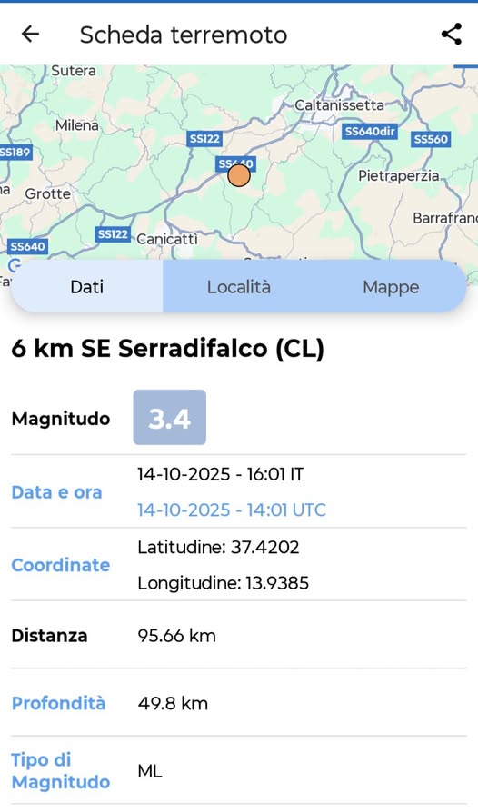 Dopo tre minuti, alle 16:04:10 una nuova scossa di magnitudo 2.6 ML a 3 km da Serradifalco, direzione Nord Estalla profondità di 7.5 km. Le rilevazioni sono state registrate dall’Istituto Nazionale di Geofisica Vulcanologia (INGV), al cui sito è possibile registrarsi e comunicare eventuali risentimenti dei terremoti.