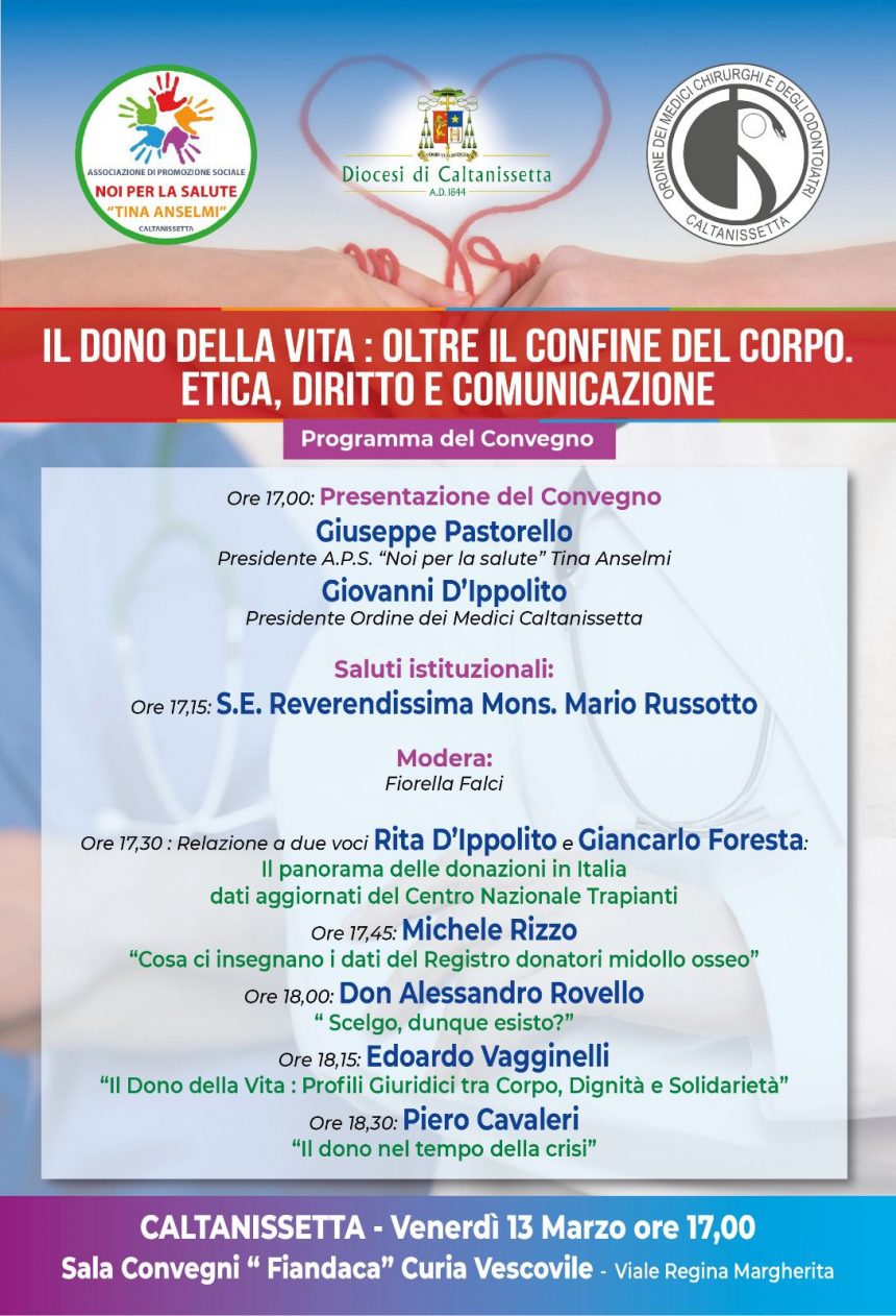 L’Associazione “Noi per la salute-Tina Anselmi“, L’Ordine dei Medici e la Diocesi di Caltanissetta promuovo il Convegno “Il dono della vita: Oltre il confine del corpo. Etica, diritto e comunicazione”, che si terrà venerdì 13 marzo alle ore 17 nella Sala “Fiandaca” del Seminario Vescovile.