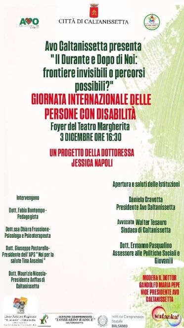 Il futuro delle persone con disabilità è un tema cruciale e sempre attuale. L’AVO Caltanissetta, con il Patrocinio del Comune di Caltanissetta ed il supporto dell’ Assessorato alle Politiche Sociali e Socio Sanitarie e dell’Assessore al ramo, Ermanno Pasqualino, ed anche alla collaborazione con l’APS ” Noi per la salute Tina Anselmi “, invita a discuterne in occasione della Giornata Internazionale delle Persone con Disabilità alla conferenza “Il Durante e Dopo di Noi: frontiere invisibili o percorsi possibili?”