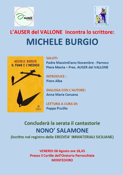 Ieri sera a Montedoro, l’associazione Auser del Vallone ha organizzato una serata culturale di grande interesse con la presentazione del libro “Il fumo e l’incenso” di Michele Burgio, pubblicato da Bompiani.
