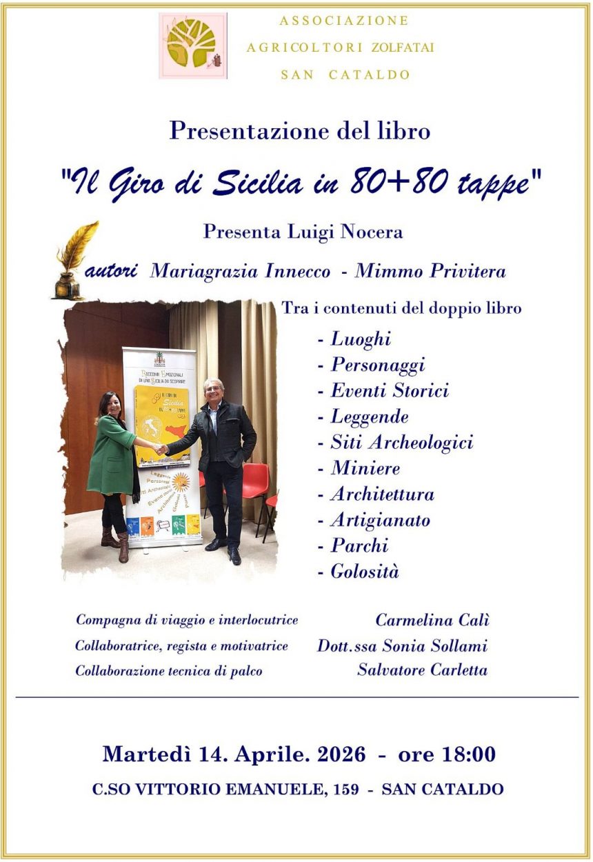 Eventi“Il Giro di Sicilia in 80+80 tappe” si presenta a San Cataldo il 14 aprile Ultimo aggiornamento: Aprile 12, 2026 7:53 am redazione 67 Views Condividere CONDIVIDERE TAGGED:Carmelina CalìLuigi NoceraMariagrazia InneccoMimmo PriviteraSalvatore CarlettaSonia Sollami Condividi Questo Articolo Facebook Twitter Whatsapp Whatsapp Copy Link Print