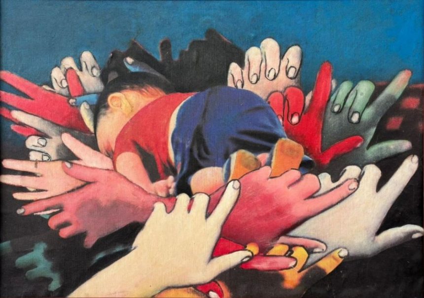 Chi è il bimbo sostenuto da queste innumerevoli mani? Lo stanno proteggendo o incombono su di lui? In quest’opera, il pittore Giuseppe Ciani si ispira a un fatto di cronaca che scosse l’opinione pubblica: il 2 settembre 2015, il piccolo Alan Kurdi venne ritrovato riverso sulla spiaggia di Ali Hoca, vicino a Bodrum. La sua famiglia stava fuggendo dalla guerra civile in Siria su un piccolo gommone che, poco dopo la partenza, fu capovolto dalle onde.