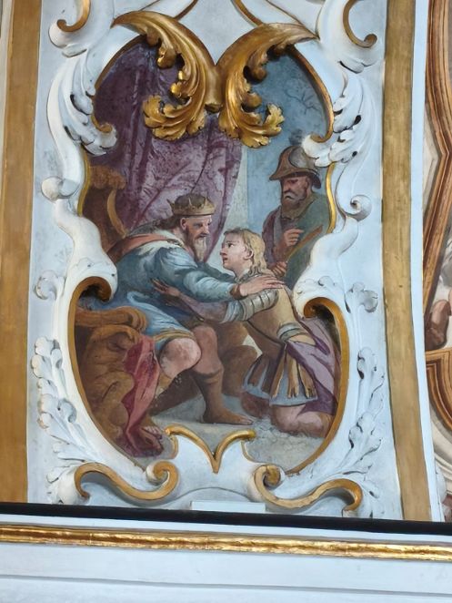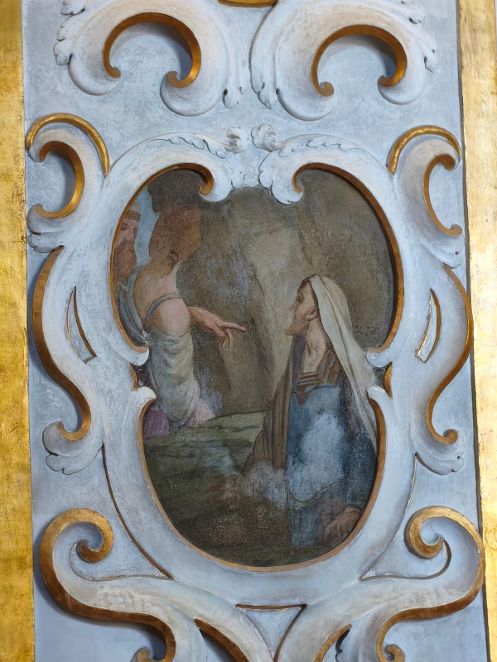 Dove un tempo c’era l’organo, lo spazio ridotto consente solo due riquadri per due minuscole storie: Giaele e Albimelech. Siamo nel libro dei giudici, e la prima uccise il generale nemico Sisara piantandogli un piolo nella tempia, liberando così Israele, il secondo figlio di Gedeone, re violento e ambizioso che finì ucciso da una donna che gli gettò una macina sulla testa.