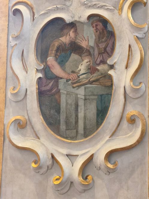 Ma prima che i colori freschi si mostrino alla città e al futuro, è doveroso chiudere questo viaggio dentro il cuore del Borremans. La terza e ultima tappa. Dopo aver sollevato lo sguardo alla volta e contemplato Angeli, Madonne, Santi, Apostoli e Martiri, oggi lo abbassiamo, anche solo di qualche metro, per scoprire la grande storia della Bibbia, che scorre come un fiume lungo gli archi che sorreggono il tempio: storie dell’Antico Testamento, pilastri di fede che sorreggono idealmente anche le vicende dei santi narrate sopra.