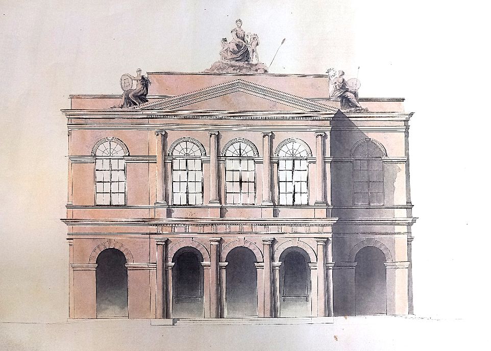 Il teatro sorgerà con un maestoso prospetto laterale sulla odierna via Paolo Emiliani Giudici che ha una pendenza differente da quella attuale. Il prospetto principale invece darà sul largo che ha come limite e sfondo la facciata della chiesa di Santa Croce. Guarnito di una grande timpano, sormontato da un largo frontone su cui sorge una figura femminile, accompagnata ai lati da altre due maschili, tutte a rappresentare i diversi generi teatrali come la commedia, l’umorismo, la tragedia, il dramma. Più in basso sui due lati trovano sede due muse. Quella a sinistra (verosimilmente Euterpe, musa della poesia e della lirica) tiene uno scudo su cui è raffigurato il castello tri-turrito, emblema della città.
