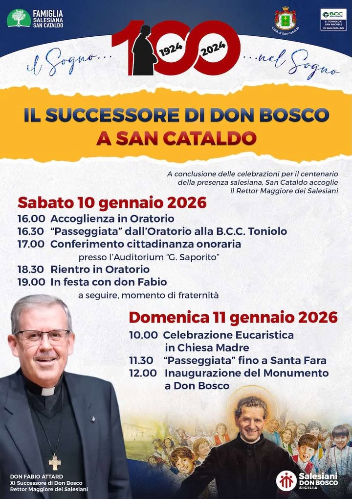 Don Fabio Attard, Rettor Maggiore dei Salesiani, sarà a San Cataldo il 10 e l’11 gennaio, a conclusione dell’anno del Centenario della presenza salesiana.