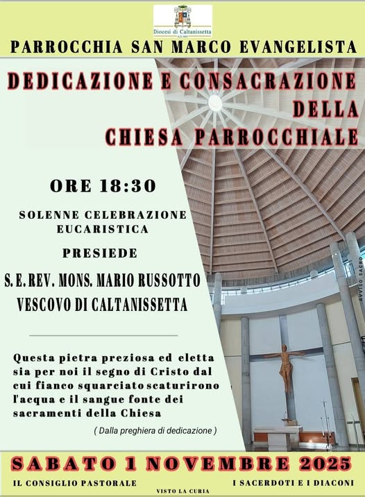 Sarà consacrata solennemente il 1° novembre la chiesa di San Marco, presidio di spiritualità accogliente in uno dei nuovi popolosi quartieri nisseni, retta dal parroco Padre Antonio Lovetere, sabato 1° novembre, alle ore 18,30, con una celebrazione eucaristica presieduta dal Vescovo mons. Mario Russotto.