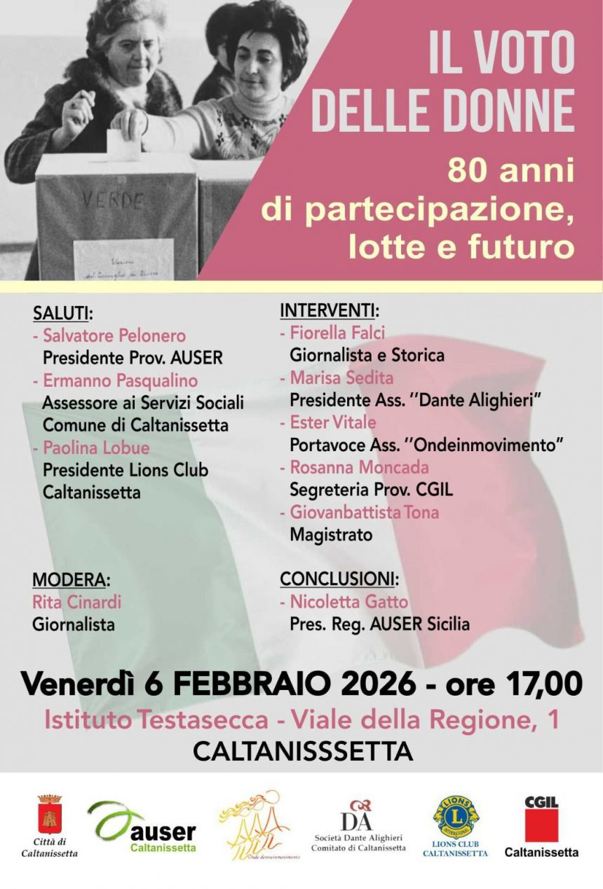 “Il voto delle donne: 80 anni di partecipazione, lotte e futuro” è il titolo del convegno organizzato dall’AUSER di Caltanissetta insieme al Comune e a “Onde Donneinmovimento”, CGIL, Lions Club, Società Dante Alighieri, che si terrà venerdì 6 febbraio, alle 17, all’Istituto Testasecca (viale della Regione, 1).