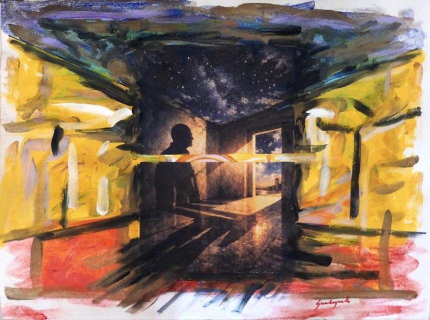 Il monologo e l’opera pittorica “Il Cielo in una stanza” di Francesco Guadagnuolo non sono in rapporto illustrativo ma in risonanza. La pittura apre la frattura, dissolve la stanza, fa emergere il cielo, genera l’ombra, la scrittura la attraversa, ne abita la soglia,  lo interroga e  le dà intenzione.