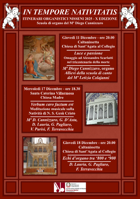 Si svolgeranno nei giorni 11, 17 e 18 Dicembre i tre appuntamenti della rassegna “In tempore Nativitatis – Itinerari organistici nisseni 2025”, per la direzione artistica del Mº Diego Cannizzaro. La rassegna, giunta alla decima edizione, è frutto del duplice impegno che la scuola d’organo del Conservatorio Statale Vincenzo Bellini di Caltanissetta profonde nella formazione degli studenti e nella valorizzazione del prezioso patrimonio organario del territorio nisseno.