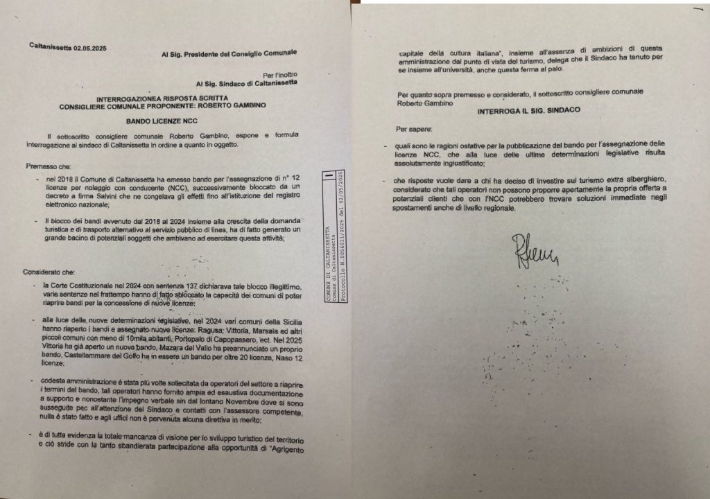 Oggi ho presentato una interrogazione, che si allega, in cui chiedo conto all’amministrazione della mancata stesura e pubblicazione del bando per il nolo con conducente (NCC).