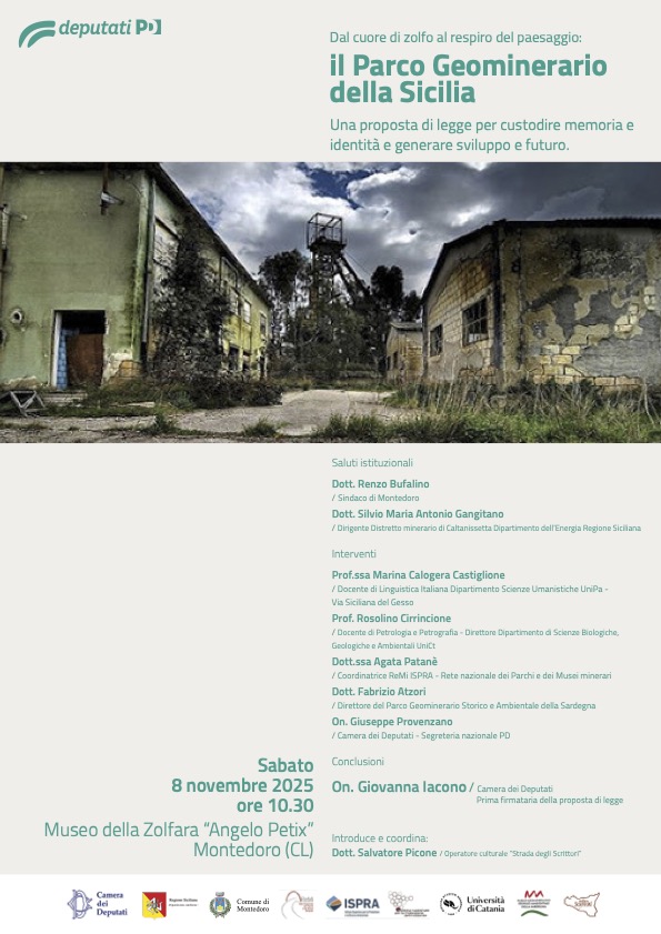 Dal cuore di zolfo al respiro del paesaggio: il Parco Geominerario della Sicilia. Una proposta di legge per custodire memoria e identità e generare sviluppo e futuro” è il titolo dell’incontro di presentazione della proposta di legge Istituzione del Parco Geominerario della Sicilia” che l’on. Giovanna Iacono (PD) ha proposto alla Camera dei Deputati. L’incontro si terrà a Montedoro sabato 8 novembre 2025 alle ore 10.30 presso il Museo della Zolfara “Angelo Petix”. Un incontro per discutere di una proposta di legge che mira a valorizzare uno dei patrimoni più autentici della Sicilia: la sua storia mineraria.