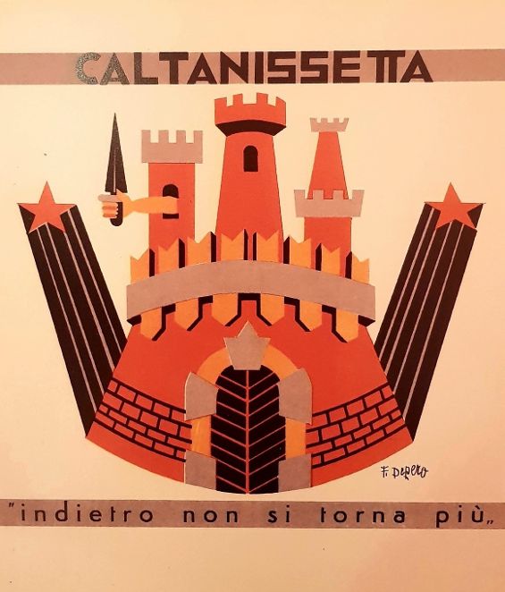 Ma veniamo allo stemma: Depero ridisegna, con il suo peculiare stile, il simbolo, lo stemma istituzionale della città: «Un Castello a tre torri merlate, in oro su campo rosso, sormontato da una corona araldica antica; da una delle tre torri, la laterale a destra guardando, esce la testa di un guerriero con elmo in testa e visiera alzata, mentre dal l’altra torre, a sinistra guardando, esce una mano che impugna la spada». Depero elimina il guerriero con elmo in testa e visiera alzata e aggiunge due stellette con scia tridimensionale, a destra e a sinistra dell’immagine stilizzata del Castello. In alto, aggiunge la scritta “Caltanissetta” (in maiuscolo) e in basso l’emblematico motto: «Indietro non si torna». Sono certo che se a quell’epoca ci fosse stata l’antenna RAI di colle Sant’Anna, realizzata nel 1951 e abbattuta di recente, da buon futurista egli avrebbe inserito questo speciale simbolo della modernità e del progresso nel suo stemma della città di Caltanissetta.