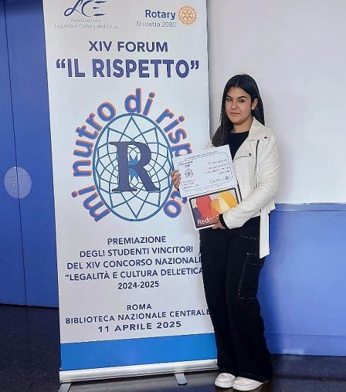 Venerdì 11 aprile, presso la Biblioteca Nazionale Centrale di Roma, la studentessa Karol Nicoletti, della classe 3E dell’Istituto Comprensivo “G. Carducci” di San Cataldo, ha ritirato il riconoscimento per il terzo posto assoluto – Scuole Medie, al concorso nazionale “Legalità e cultura dell’etica” 2024-2025.
