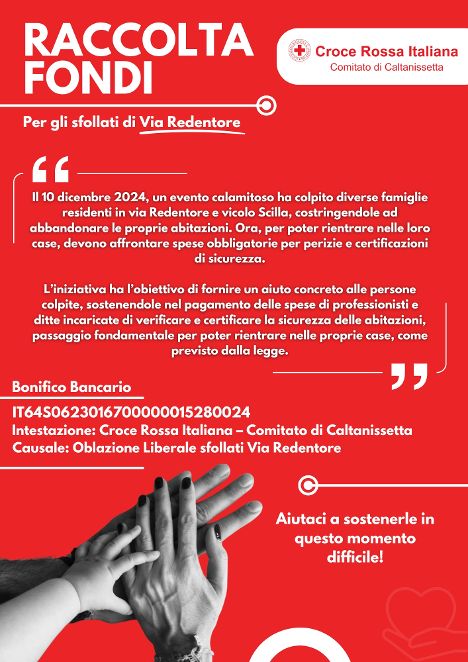 La Croce Rossa Italiana – Comitato di Caltanissetta, su invito di alcuni cittadini nisseni ed in ossequio ai suoi principi solidaristici, ha deciso di mettere a disposizione la propria organizzazione per una raccolta fondi straordinaria per sostenere i cittadini interessati dall’evento calamitoso che ha colpito alcune famiglie residenti in via Redentore e vicolo Scilla il 10 dicembre 2024. La situazione di pericolo venutasi a creare ha costretto numerosi nuclei familiari ad abbandonare le proprie abitazioni, trovandosi improvvisamente in condizione di vulnerabilità.