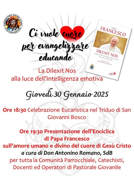 Eventila “Dilexit Nos” di Papa Francesco alla luce dell’intelligenza emotiva, il 30 gennaio Ultimo aggiornamento: Gennaio 20, 2025 1:35 pm redazione 84 Views Condividere CONDIVIDERE Condividi Questo Articolo Facebook Twitter Whatsapp Whatsapp Copy Link Print