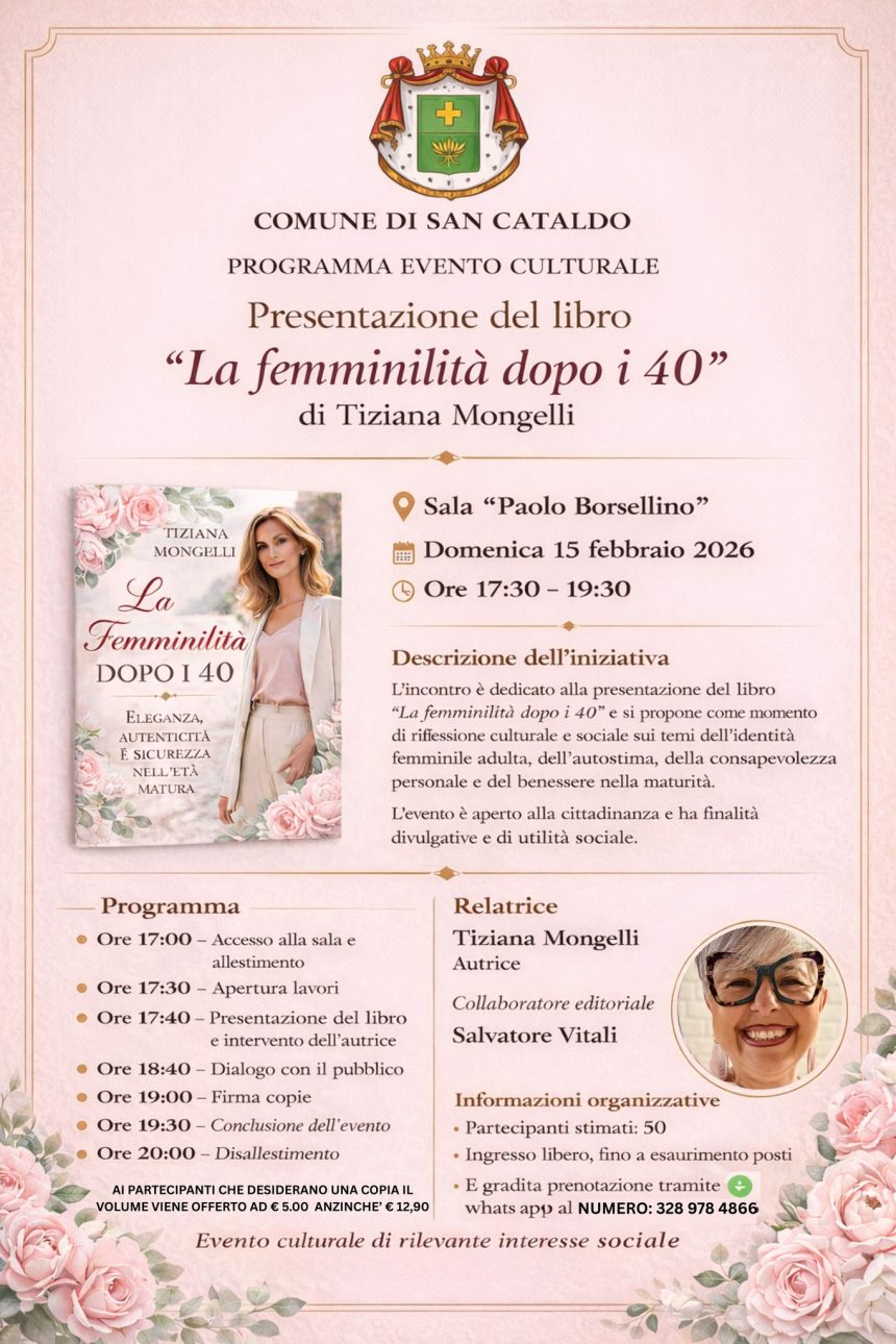 Eventi“La femminilità dopo i 40” di Tiziana Mongelli si presenta a San Cataldo Ultimo aggiornamento: Febbraio 11, 2026 1:02 pm redazione 69 Views Condividere CONDIVIDERE TAGGED:Salvatore VitaliTiziana Mongelli Condividi Questo Articolo Facebook Twitter Whatsapp Whatsapp Copy Link Print