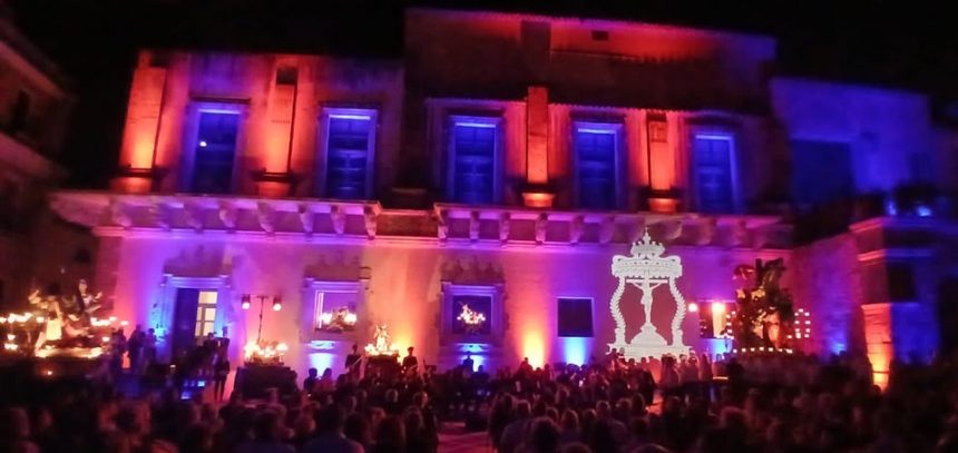 Sullo sfondo il palazzo Moncada illuminato, a ricordare la storia di un casato che su Caltanissetta aveva investito risorse e progetti, facendo della sua corte nissena, tra ‘500 e ‘600, una delle corti rinascimentali più importanti del meridione.