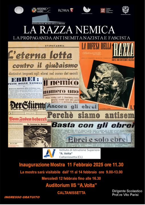 EventiLa mostra ” La razza nemica-la propaganda antisemita nazista e fascista”si inaugura l’11 febbraio alle 11,30 nell’Auditorium del liceo “A. Volta” Ultimo aggiornamento: Febbraio 9, 2025 12:51 pm redazione 102 Views Condividere CONDIVIDERE TAGGED:vito parisi Condividi Questo Articolo Facebook Twitter Whatsapp Whatsapp Copy Link Print