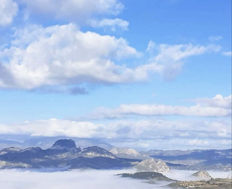 Sutera, sul suo monte a “panettone” stamattina è una grande isola che si adagia sopra questo lago, sempre con il monte Cammarata dietro a guardarle le spalle.