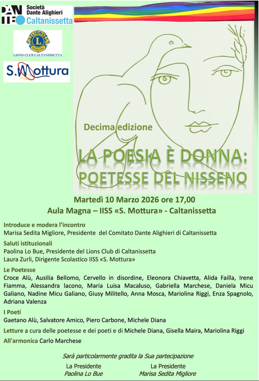 Come è ormai tradizione in occasione della Giornata Internazionale della Donna il Comitato nisseno della Società Dante Alighieri promuove la poesia al femminile, quest’anno il 10 marzo, alle ore 17, nell’Aula Magna dell’Istituto “Mottura”, con un reading delle opere di 16 autrici e 4 autori, in collaborazione con il Lions Club Caltanissetta e l‘Istituto “Mottura”.