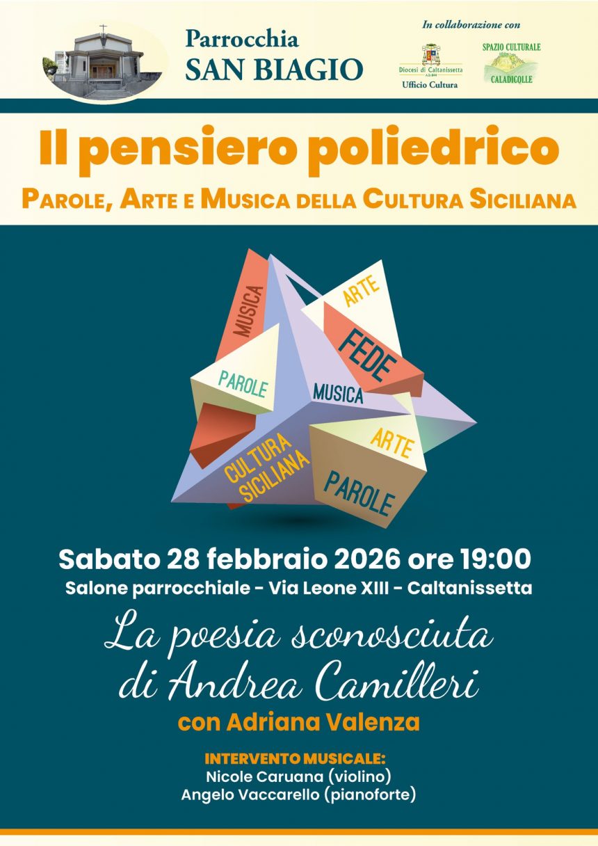 Per il ciclo “Il pensiero poliedrico” incontri su letteratura, arte e musica della cultura siciliana, sabato 28 febbraio alle ore 19, nel salone della parrocchia San Biagio, la Prof. Adriana Valenza, docente di letteratura italiana al Liceo Scientifico “Volta” e scrittrice pluripremiata, illustrerà “La poesia sconosciuta di Andrea Camilleri“, una produzione quasi ignota del grande scrittore siciliano, maturata soprattutto negli anni del dopoguerra, scoperta estremamente interessante della critica più recente.