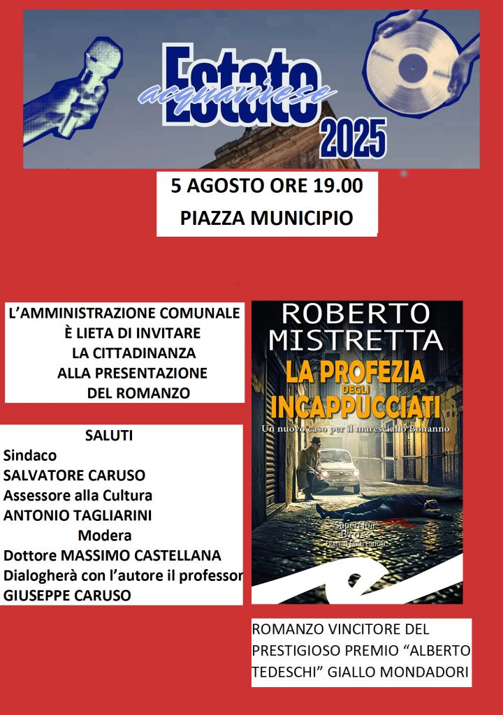 La location sintetizza il senso della storia di questo angolo di Sicilia dell’interno in cui ieri sera è stato presentato l’ultimo romanzo di Roberto Mistretta: “La profezia degli incappucciati” (Fratelli Frilli editori): il murale su Salvatore Quasimodo, vissuto ad Acquaviva dal 1912 al 1913, che campeggia sulla facciata del Palazzo Comunale ricorda come gli autori della grande letteratura italiana e internazionale siano passati da queste contrade, in cui hanno maturato la loro visione del mondo che hanno poi trasfigurato nella loro produzione poetica e letteraria. Oggi questi paesi vivono pesantemente la desertificazione, economica e sociale, ma mantengono accesa la lampada della cultura e la sua capacità di esprimere quello che vive, i valori, le energie positive, le complessità negate dalle “versioni ufficiali” che leggono le trasformazioni sociali.