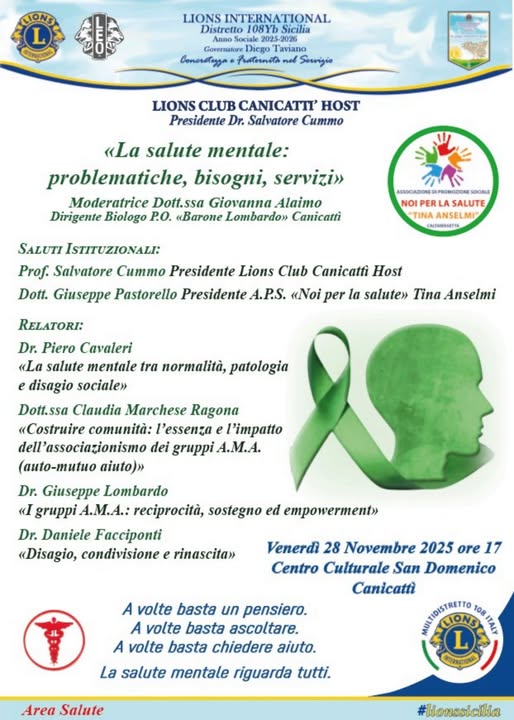 Venerdì 28 novembre alle ore 17, a Canicattì, al Centro Culturale San Domenico, il Lions Club di Canicattì Host, presieduto dal dott. Salvatore Cummo, ha invitato l’Associazione “Noi per la salute – Tina Anselmi” presieduta dal dott. Giuseppe Pastorello, per un incontro sul tema “La salute mentale: problematiche, bisogni, servizi“. A moderare l’incontro sarà la dott. Giovanna Alaimo, relatori il dott. Piero Cavaleri, la dott. Claudia Marchese Ragona, il dott. Giuseppe Lombardo e il dott. Daniele Facciponti.