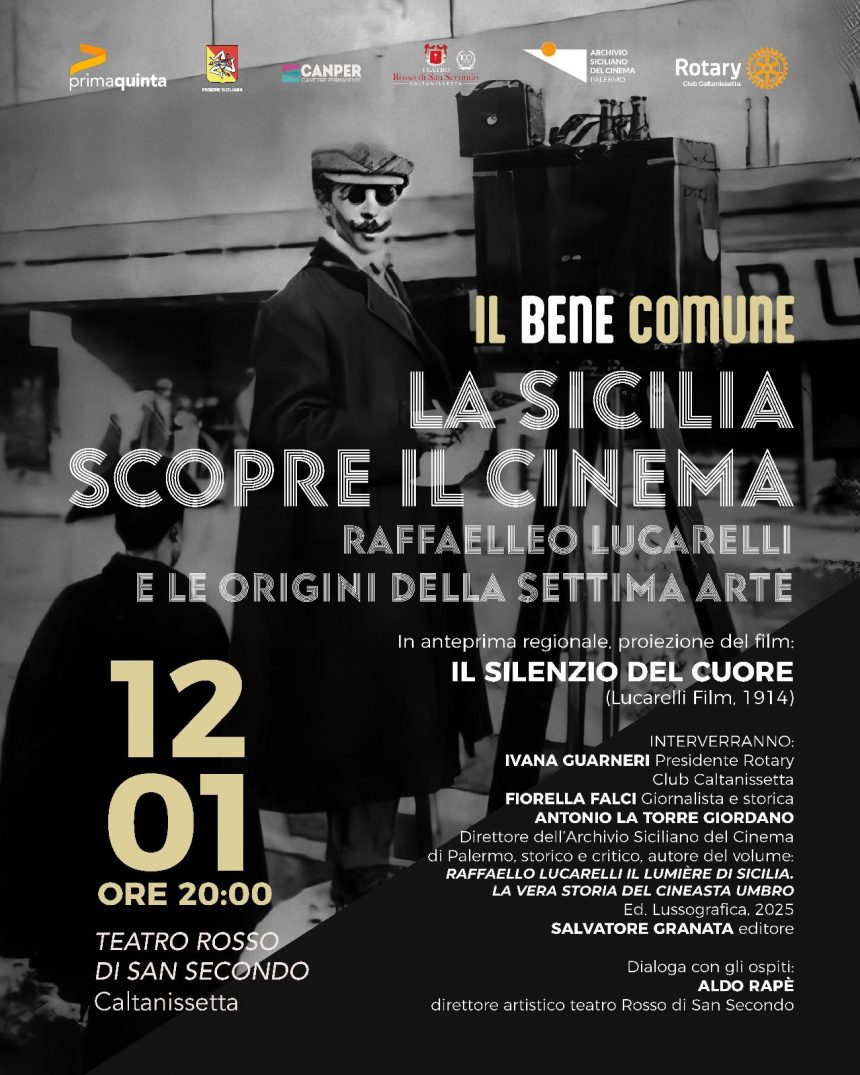Un film a colori del 1914 “Il silenzio del cuore”, prodotto in Sicilia dalla prima casa di produzione nata nell’isola nel 1905 ad opera di Raffaello Lucarelli, sarà proiettato al teatro Rosso di san Secondo di Caltanissetta lunedì 12 gennaio, alle 20, nell’ambito della serata “La Sicilia scopre il cinema”, promossa dal Rotary Club di Caltanissetta e da Prima Quinta, di Aldo Rapè, direttore artistico del teatro.