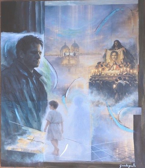 F. Guadagnuolo: Un ruolo assoluto. Io non ho dipinto ascoltando la marcia: ho dipinto attraverso la marcia. È un suono che non accompagna la processione: la genera. È un suono bellissimo, straziante, che non consola ma apre. Ogni pennellata è stata una nota. Ogni pausa è stata un vuoto necessario. Il romanzo ha fatto la stessa cosa: ha lasciato che la marcia lo attraversasse.