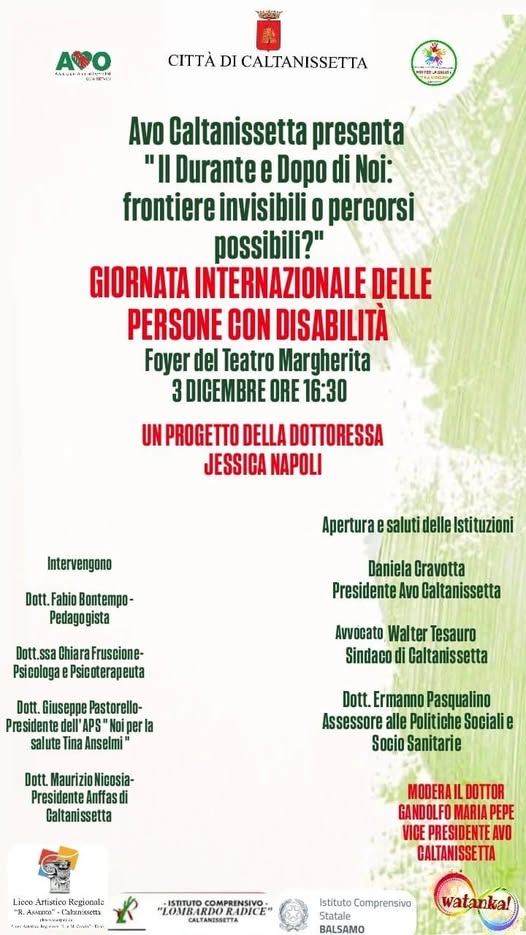In vista della Giornata Internazionale della Disabilità, AVO Caltanissetta ha organizzato un progetto redatto dalla Dottoressa Jessica Napoli,in partnership con diverse realtà, associazioni e Istituzioni: Comune di Caltanissetta, Assessorato alle politiche sociali e socio sanitarie, Aps Noi per la salute Tina Anselmi, Istituto Comprensivo Balsamo di San Cataldo, Istituto Comprensivo Lombardo Radice di Caltanissetta, Liceo Artistico Rosario Assunto, Anffas di Caltanissetta, Pedagosti e Psicologi.