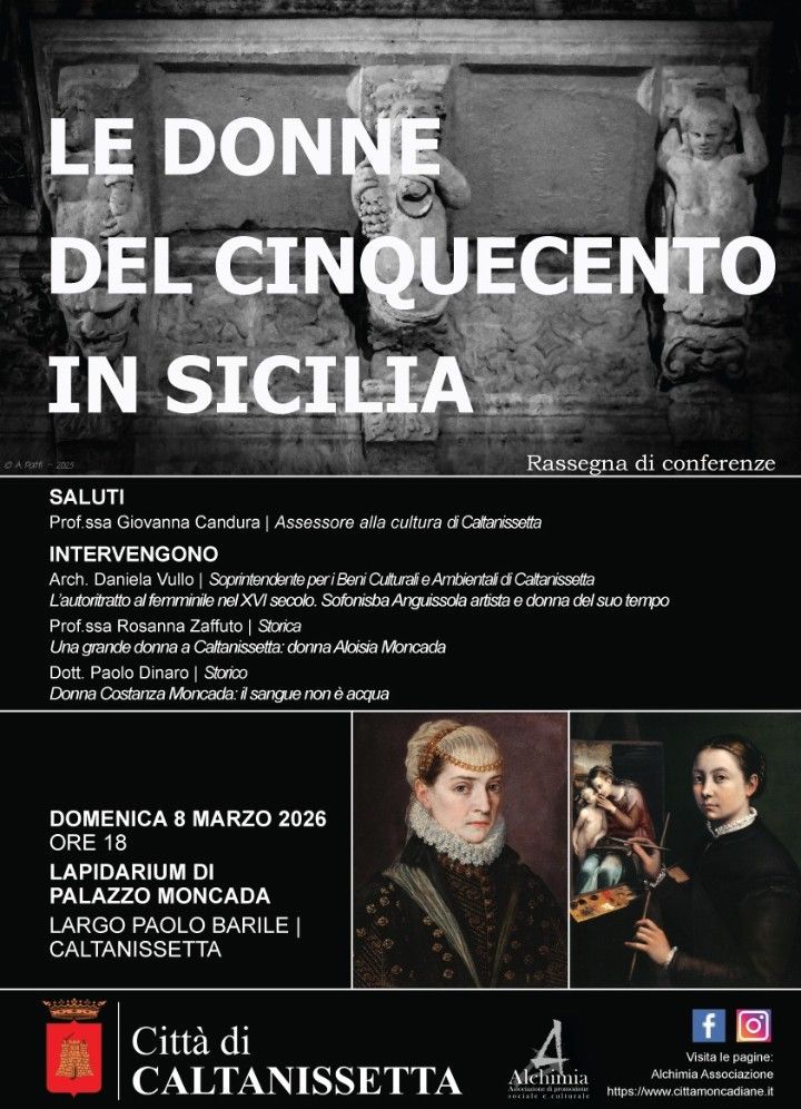 Dopo il saluto istituzionale dell’assessora alla Cultura e Vice-Sindaca prof. Giovanna Candura, si alterneranno gli interventi dell’arch. Daniela Vullo, Soprintendente ai BB.CC.AA. di Caltanissetta (“L’autoritratto al femminile nel XVI secolo. Sofonisba Anguissola artista e donna del suo tempo“), della prof. Rosanna Zaffuto Rovello, storica studiosa dei Moncada e del Rinascimento nisseno (“Una grande donna a Caltanissetta: Donna Aloisia Moncada“) e del dott Paolo Dinaro, storico (“Donna Costanza Moncada: il sangue non è acqua“).