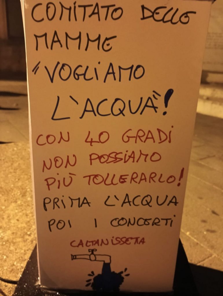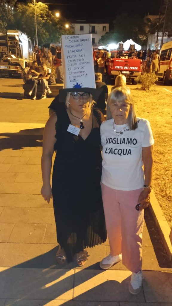 Le Mamme del Comitato per l’acqua hanno partecipato al concerto con i segni della loro protesta pacifica: magliette con la scritta “Vogliamo l’acqua” e cartelli che raccontano la contraddizione tra la temperatura torrida, 40 gradi e la mancanza di acqua per le continue interruzioni della distribuzione da parte di Siciliacque per le condutture senza adeguata manutenzione, proprio quando l’acqua nelle dighe c’è e non ci sono alibi legati alla siccità, come lo scorso anno.