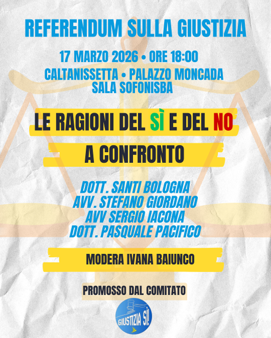 Un momento di approfondimento e confronto pubblico dedicato al referendum sulla giustizia si terrà martedì 17 marzo alle ore 18.00 a Caltanissetta, presso la Sala Sofonisba di Palazzo Moncada. L’iniziativa è promossa dal Comitato “Giustizia Sì” di Caltanissetta, con l’obiettivo di offrire ai cittadini un’occasione di informazione e dibattito su un tema centrale per il funzionamento delle istituzioni e per la vita democratica del Paese.