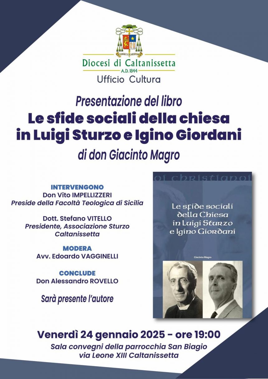 “Le sfide sociali della Chiesa in Luigi Sturzo e Igino Giordani” è il titolo del libro di don Giacinto Magro che sarà presentato a Caltanissetta venerdì 24 gennaio alle 19, nel salone della parrocchia S. Biagio (via Leone XIII).