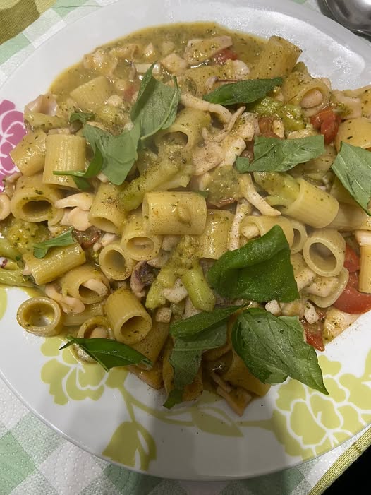 sfumare con il vino bianco e aggiungere i pomodorini tagliati e appena il calamaro sarà cotto unire il broccoletto, fare insaporire e unire la pasta ancora al dente