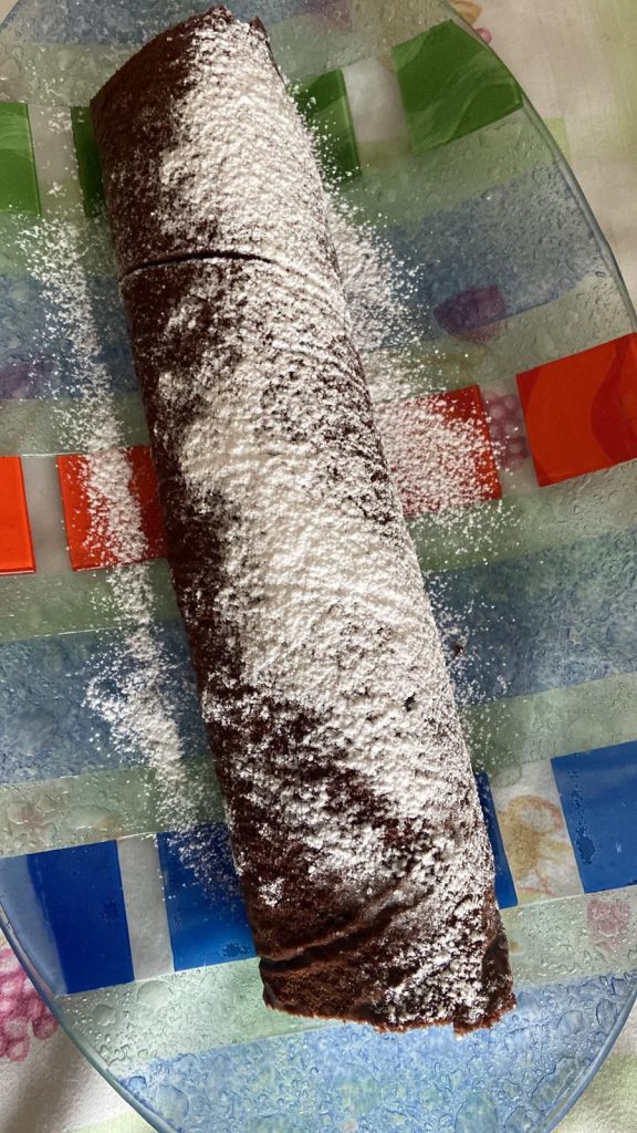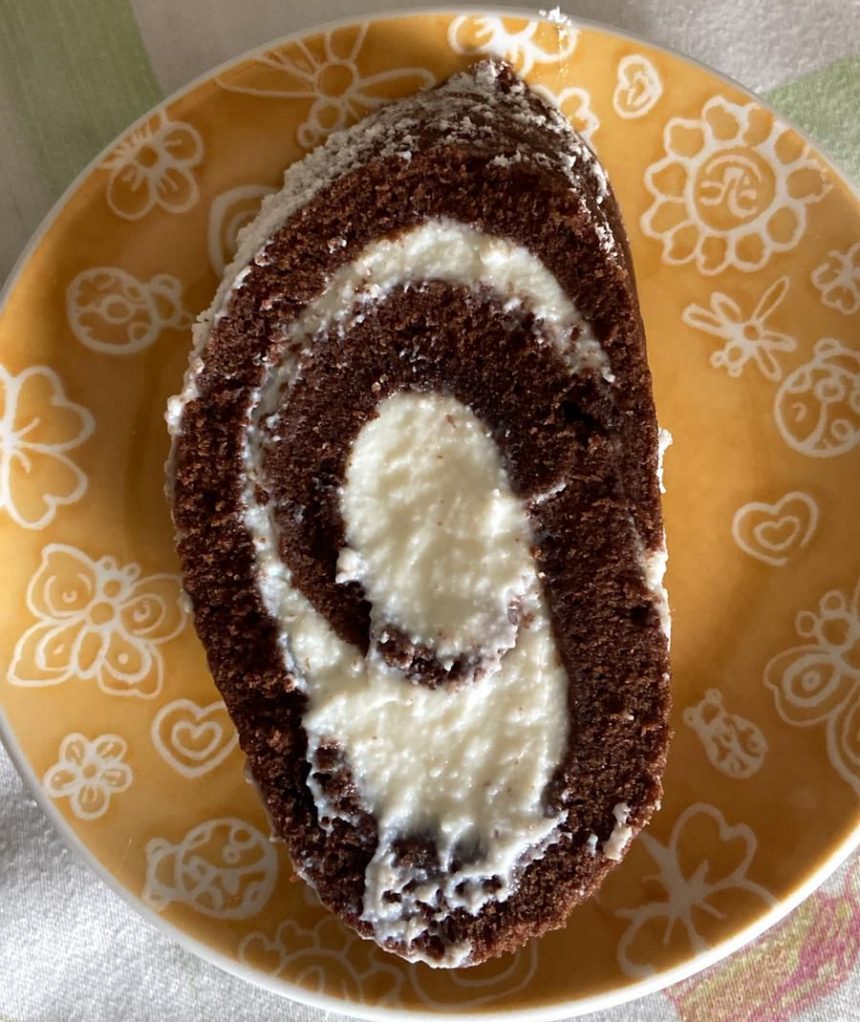 Sfornare, togliere dalla teglia, mettere sopra un altro foglio di carta forno e arrotolare con l’aiuto di un canovaccio umido