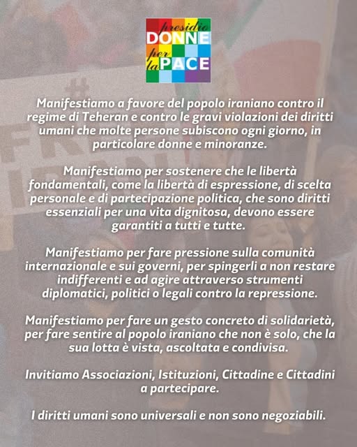 Cronaca AttualitàPrima pagina 2“Luci sull’Iran” sabato 17 gennaio a Caltanissetta il Presidio delle Donne per la Pace invita tutti a manifestare Ultimo aggiornamento: Gennaio 14, 2026 3:15 pm redazione 80 Views Condividere 0 Min Leggere CONDIVIDERE Sabato 17 gennaio, alle ore 18, presso la Scalinata di Piazza Grazia. il Presidio Donne per la Pace invita tutte e tutti a manifestare per il popolo iraniano Condividi Questo Articolo Facebook Twitter Whatsapp Whatsapp Copy Link Print