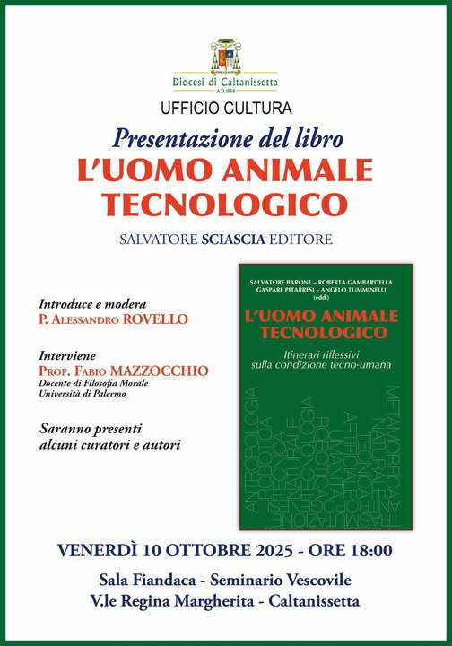 “L’uomo animale tecnologico. Itinerari riflessivi sulla condizione tecno-umana“, edito da Salvatore Sciascia, è uno studio che riunisce contributi di diversi autori: Salvatore Barone, Roberta Gambardella, Gaspare Pitarresi e Angelo Tumminelli, che sarà presentato a Caltanissetta venerdì 10 ottobre alle 18 nella Sala Fiandaca del Museo Diocesano, a cura dell’Ufficio diocesano Cultura diretto da padre Alessandro Rovello, che introdurrà e modererà l’incontro.