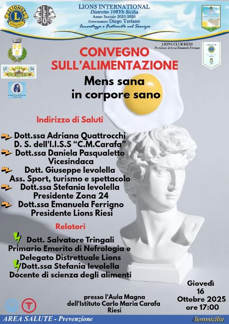 “Mens sana in corpore sano“, l’antica massima di Giovenale è il titolo del Convegno che, in occasione della Giornata Mondiale dell’Alimentazione 2025, il Lions club Riesi in collaborazione con l’Istituto Carlo Maria Carafa ha organizzato il 16 ottobre, nell’Aula Magna dell’istituto scolastico.