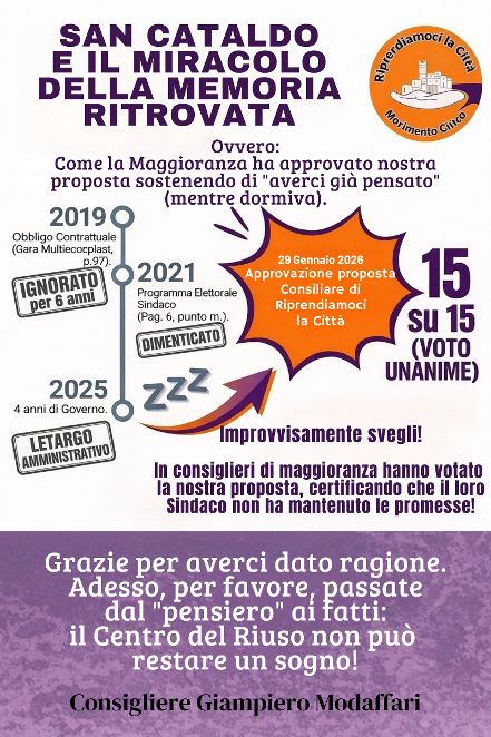 È quasi commovente osservare come questi “smemorati” della politica abbiano finito per approvare – loro malgrado – la proposta di RIPRENDIAMOCI LA CITTÀ, votando all’unanimità (15 su 15) nella seduta del Consiglio Comunale del 29 Gennaio 2026, un atto che, di fatto, mette a nudo il loro fallimento.