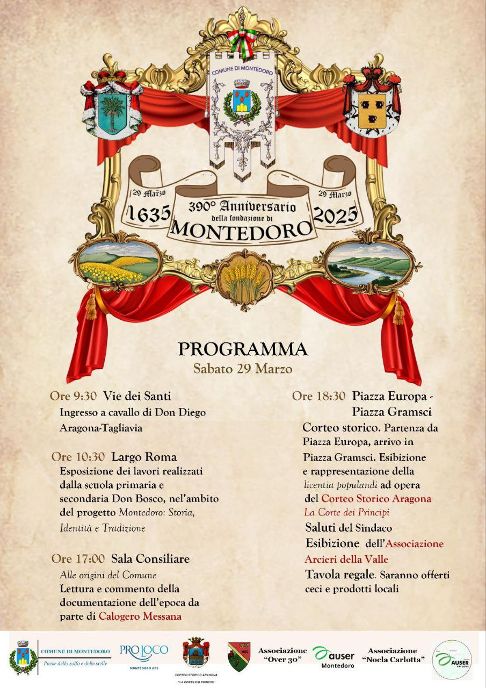 Le celebrazioni avranno inizio alle ore 9:30 con l’ingresso a cavallo di Don Diego Aragona-Tagliavia lungo le Vie dei Santi, un momento simbolico che richiama le origini storiche del Comune. Seguirà, alle ore 10:30 in Largo Roma, l’esposizione dei lavori realizzati dagli studenti della scuola primaria e secondaria, nell’ambito del progetto “Montedoro: Storia, Identità e Tradizione”.