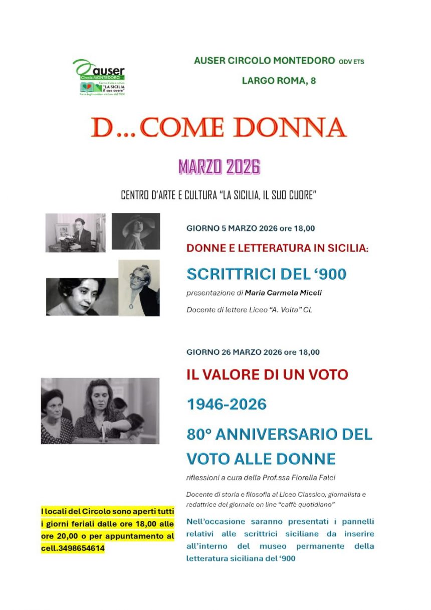 La giornata Internazionale della Donna viene celebrata con impegno particolare dal Circolo AUSER di Montedoro (largo Roma, 8): giovedì 5 marzo alle ore 18 la presentazione del progetto “Donne e Letteratura in Sicilia – Scrittrici del ‘900” a cura della Prof. Maria Carmela Miceli, docente di Letteratura Italian a presso il Liceo Scientifico “A. Volta” di Caltanissetta.