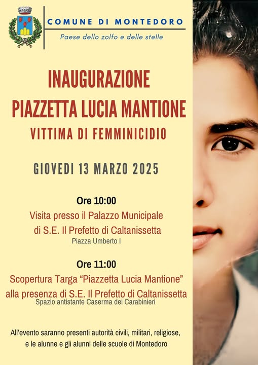 Montedoro ha celebrato con solennità la memoria di Lucia Mantione, Luciedda per tutti, uccisa a 13 anni durante un tentativo di violenza alla quale si era opposta con tutte le sue forze. Settant’anni dopo il femminicidio è stata dedicata a Lucia la piazzetta antistante la caserma dei Carabinieri e così il suo nome rimarrà per sempre presente nella vita quotidiana dei suoi concittadini.