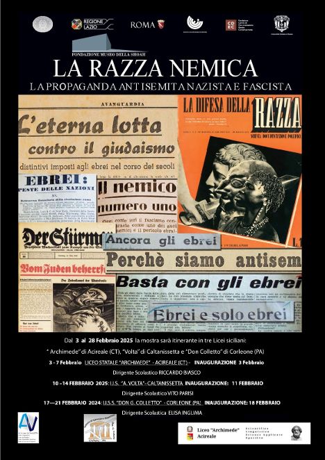 Il Liceo nisseno “Alessandro Volta” celebra la Giornata della Memoria della Shoah con una importante mostra, promossa dalla Fondazione Museo della Shoah e che si avvale del patrocinio della Presidenza del Consiglio dei Ministri, della Regione Lazio, di Roma Capitale, dell’Unione delle Comunità Ebraiche Italiane, del CDEC, Fondazione Centro di Documentazione Ebraica Contemporanea e della Comunità Ebraica di Roma.