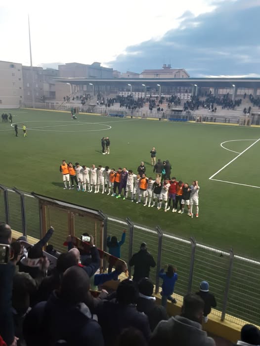 Ovviamente, dopo il triplice fischio dell’arbitro Deborah Bianchi, i calciatori nisseni hanno ringraziato i propri tifosi, portandosi sotto la gradinata e festeggiando con loro una vittoria voluta e meritata.